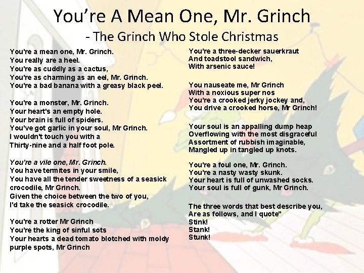 The funniest line has to be the lyric The three words that best describe you are as follows and I quote. Maybe Christmas perhaps means a little bit more LOVE THAT. Youre a Mean One Mr.